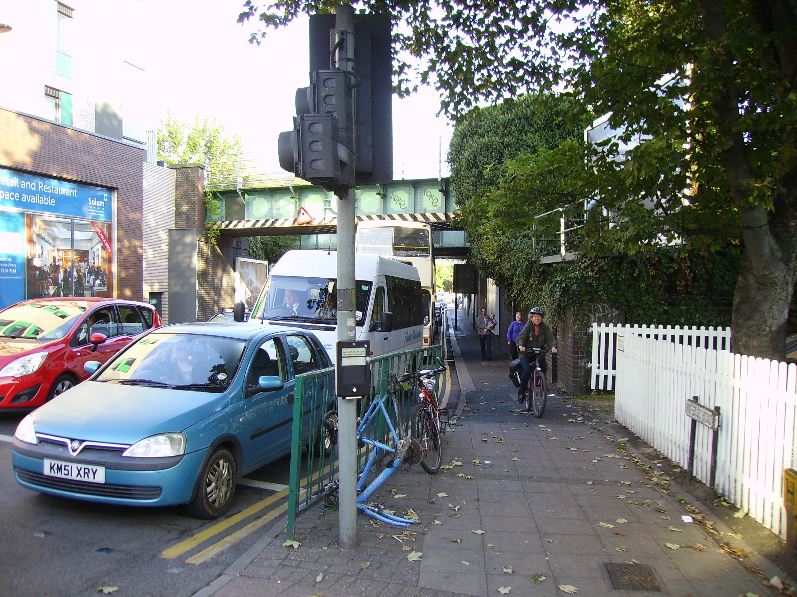 Until this scheme was introduced, cyclists approaching Epsom along Waterloo Road at peak times were being blocked by a queue of traffic under the railway bridge that was difficult to get past. As a result, many walked or cycled along the footway on either side. In addition, pedestrians had a narrow footway under the bridge, which was also an unattractive place at which to wait for a bus.